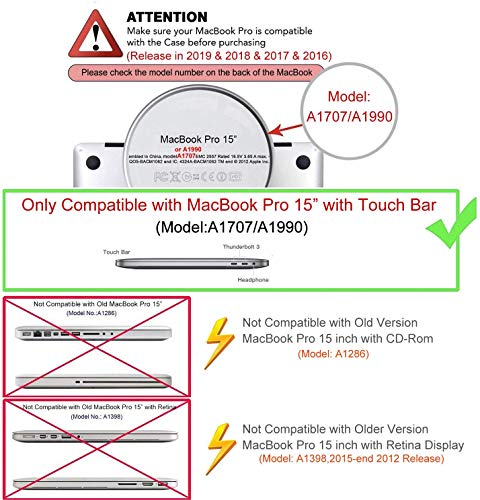 • تم تصميم الحافظة فقط لتكون متوافقة مع إصدار 2019 و2018 و2017 و2016 ماك بوك برو 15 انش مع شريط لمس وخاصية التعرف باللمس (A1990 / A1707، إصدار 2019 -- MV902LL/A، MV922LL/A، MV912LL/A، MV933 2LL/A and 2018 -- MR932LL/A، MR942LL/A -- و2017 -- MPTR2LL/A، MPTU2LL/A، MPTT2LL/A، MPTV2LL/A -- الإصدار 2016 -- MLH32LL/A، MLW72LL/A، MLH42LL/A، MLW82LL/A). تحذير: هذه الحافظة غير متوافقة مع موديلات ماك بوك الأخرى.