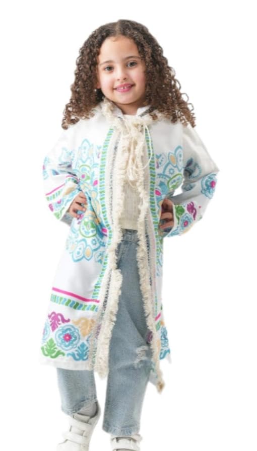 Generic - كارديجان مطرز للبنات، ابيض مع نمط زهور ملونة، كم طويل مع ربطة امامية، مقاس 4-6