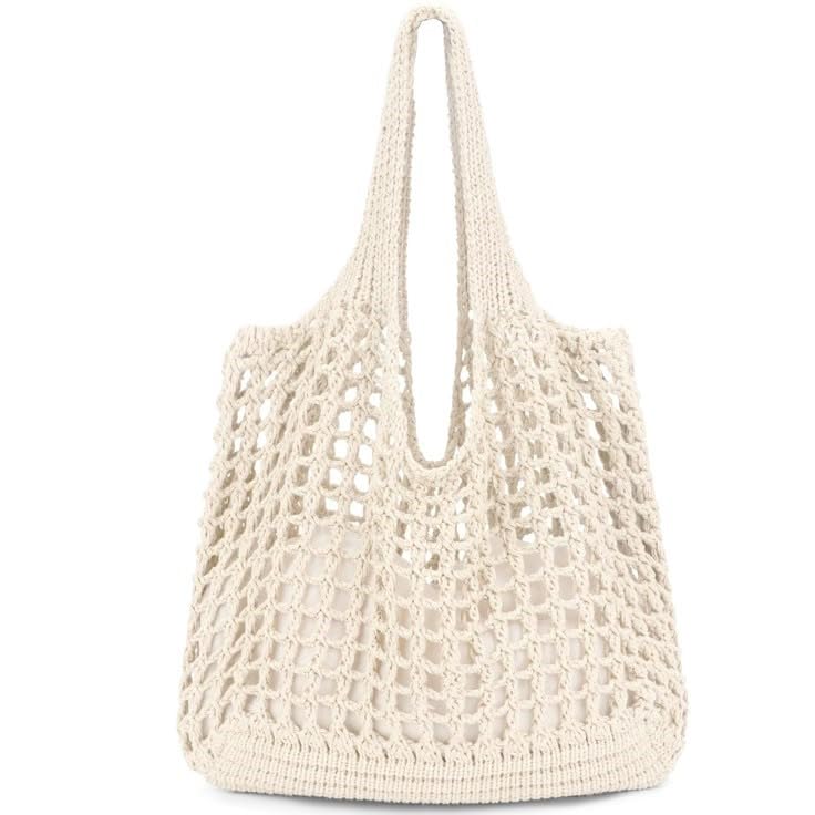 Generic - حقيبة يد كروشيه شبكية مفرغة للبنات - متعددة الاستخدام قابلة للطى وخفيفة - بدون بطانة -اللون أوف وايت فاتح لامع - طول اليد 55cm