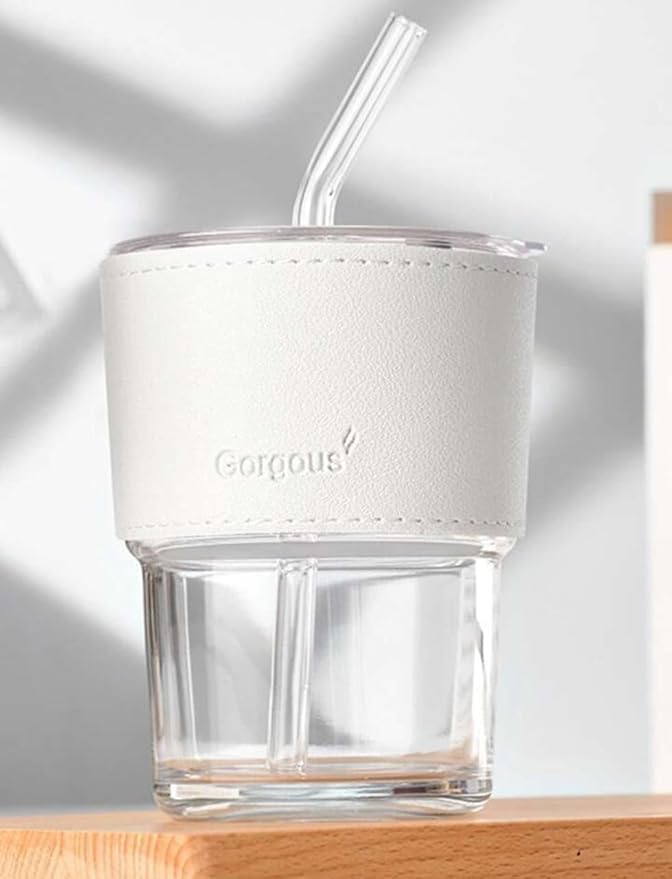 Generic - كوب زجاج بشفاطة وغطاء سعة 435 مل، مج للقهوة بغطاء جلد وفوهة شرب للاستخدام المباشر