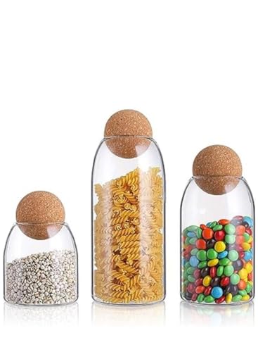 Generic - برطمان زجاجي بغطاء كروي من الفلين، 3 عبوات مع غطاء خشبي، برطمانات زجاجية لتخزين الطعام، مجموعة برطمانات زجاجية، علب زجاجية للمطبخ، للمطبخ المنزلي، للقهوة والشاي والدقيق والحلوى والبسكويت والتوابل