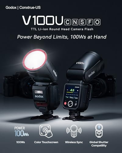 GODOX - غودوكس فلاش V100S U برأس دائري لسوني - 100 واط TTL سبيدلايت مع لاسلكي 2.4G، مزامنة غالق عالمية 1/8000s، شاشة لمس، بطارية ليثيوم ايون مدمجة، مجموعة ملحقات قبة موزع (V100-S اصدار امريكي)