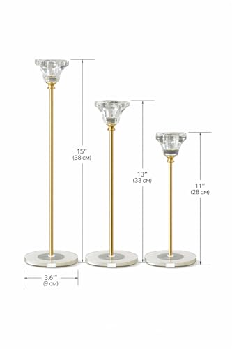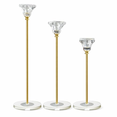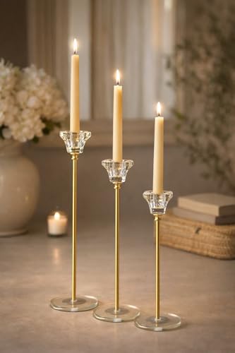 Generic - حوامل شموع معدنية ذهبية بقاعدة زجاجية ورأس كريستال شفاف، طقم 3 قطع بأطوال 28، 33، 38 سم، للديكور والمناسبات
