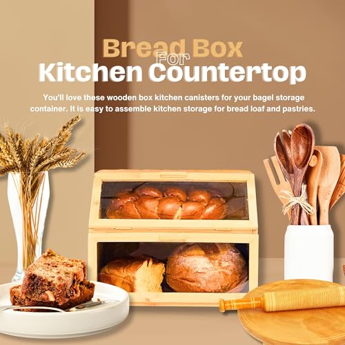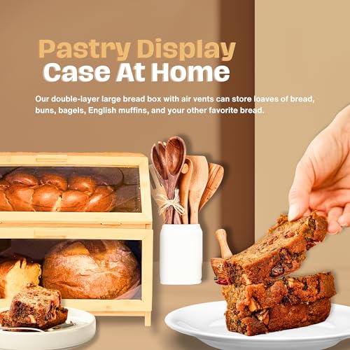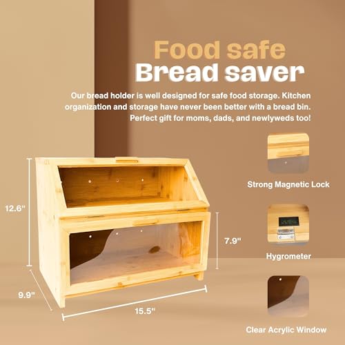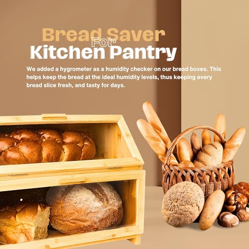 Goodscious - جودشوس صندوق خبز بتصميم ريفي لطاولة المطبخ - من طبقتين الخيزران - حامل - تخزين الخبز محلي الصنع مع نوافذ شفافة ومقياس الرطوبة مقاس XL