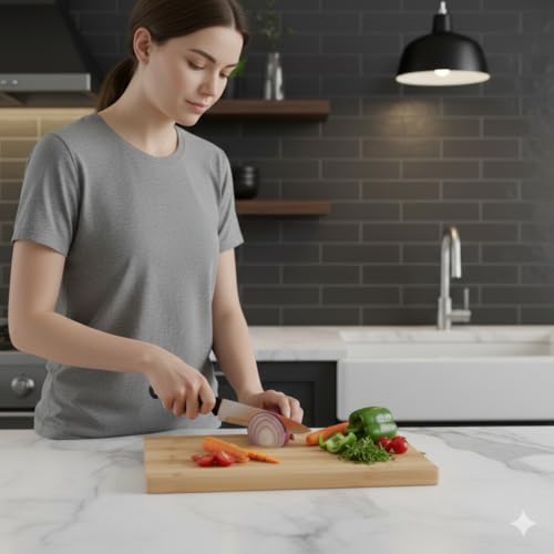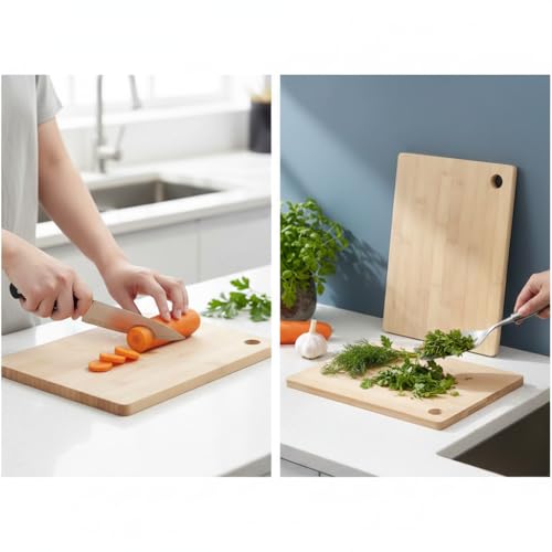 - هيكل من الخيزران الطبيعي الممتاز: مصنوع من الخيزران عالي الجودة والمستدام بنسبة 100% وهو خالٍ من البيسفينول ايه وصديق للبيئة. هذا الخشب المتين لطيف على شفرات السكين الخاصة بك، مما يمنعها من البهتان مع توفير سطح قوي لجميع احتياجات التقطيع الخاصة بك.