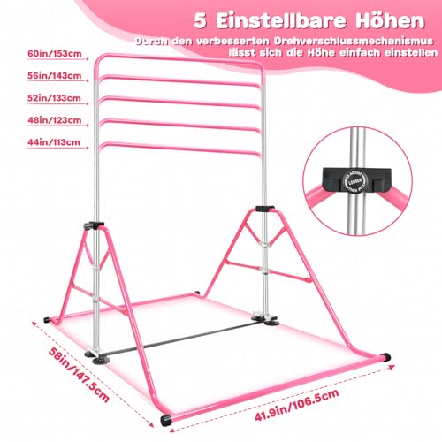 - 5 ارتفاعات قابلة للتعديل للأطفال في مرحلة النمو: يحتوي قضيب الجمباز هذا على 5 مستويات ارتفاع قابلة للتعديل (44 انش/113 سم، 48 انش/123 سم، 52 انش/133 سم، 56 انش/143 سم، 60 انش/153 سم). مع آلية قفل اللف المحسنة، يمكن تعديل الارتفاع بسهولة حسب نمو طفلك، مما يضمن الاستخدام طويل الأمد والمرح أثناء تدريب الجمباز