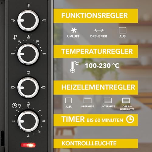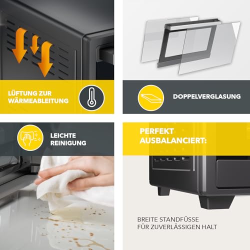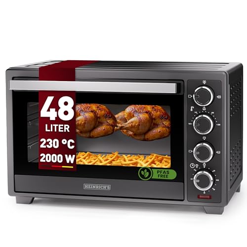 Heinrich´s - فرن صغير متعدد الاستخدامات 48 لتر، مع خاصية إعادة التدوير وتحكم باللمس، مؤقت حتى 8 ساعات، إضاءة داخلية، قابل للتعديل من 100 إلى 230 درجة مئوية، مع الاكسسوارات من هاينريتشز، أسود، 2000 وات (48 لتر)