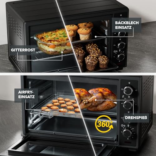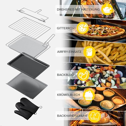 - ✨ ملحقات شاملة - كل شيء متضمن! محتويات العلبة: صينية خبز وشبكة وشواية دوارة وصينية لفتات الطعام وأداة إزالة للشبكة والصينية والسيخ، بالإضافة إلى قفاز خبز عملي. كل ما تحتاجه للبدء - جاهز للاستخدام!