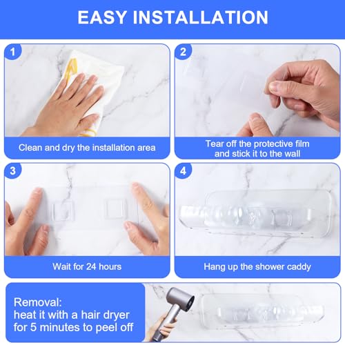 - سهل التركيب: نظف السطح، وألصق اللاصق على الحائط، وانتظر 24 ساعة لتعليق أرفف الدش للاستخدام. مناسب للأسطح الملساء والمستوية، مثل البلاط/الرخام/الزجاج/المعدن، ولكن ليس للأسطح غير المستوية مثل الجدران المطلية. كما يمكنك استخدام مجفف الشعر لإزالة المواد اللاصقة بسهولة.