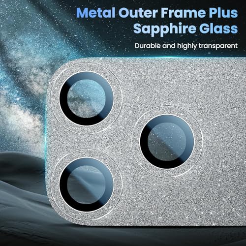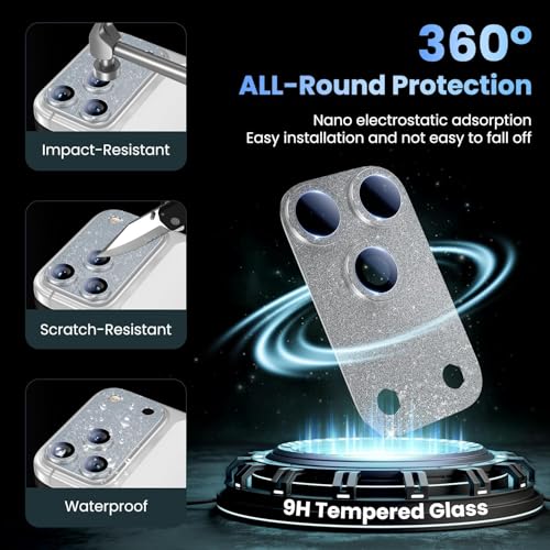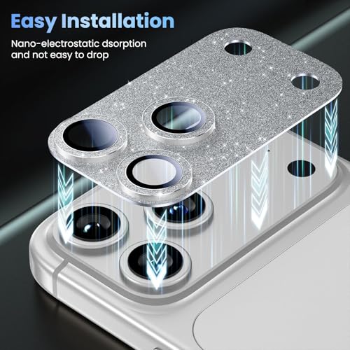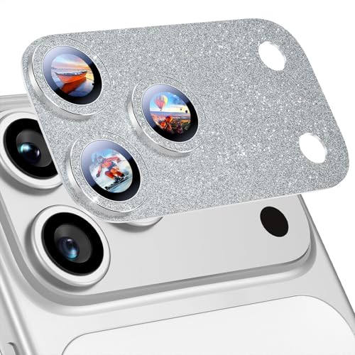 Holdex - واقي عدسة هولدكس لآيفون 17 برو، تصميم جليتر أنيق، زجاج مقوّى Ultra HD مضاد للخدش والصدمات، قوة التصاق عالية وحماية كاملة لمربع الكاميرا (Silver Glitter)