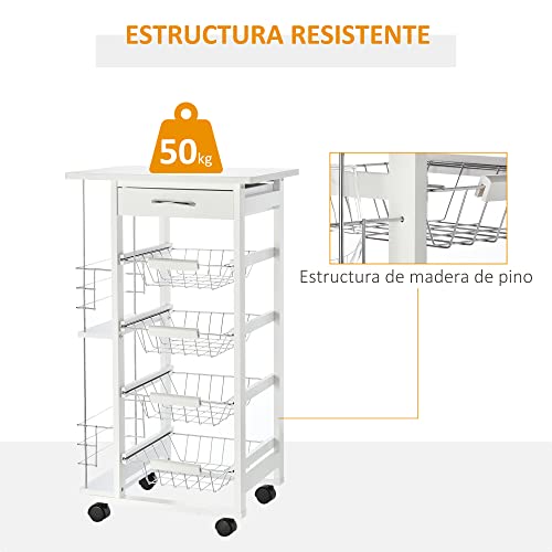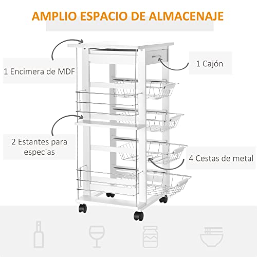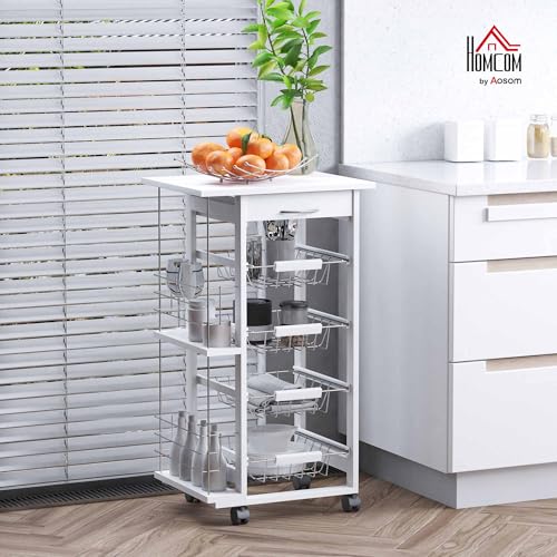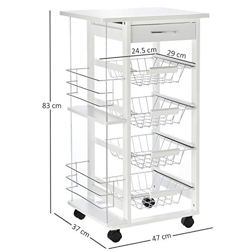 HOMCOM - عربة مطبخ متعددة الأغراض من 5 طبقات برفوف جانبية للأدراج وسلال معدنية قابلة للإزالة، 4 عجلات، مقاس 47 × 37 × 83 سم من هومكوم، أبيض