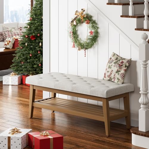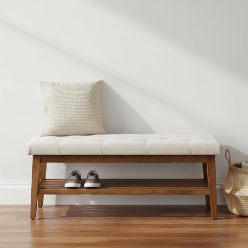 HUIMO - مقعد أحذية للمدخل منجد بأزرار لنهاية السرير والمطبخ، مقعد عثماني من القماش مبطن مع رف خشب صلب لغرفة المعيشة وغرفة النوم من هيمو