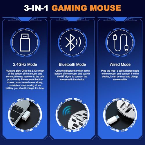 - خيارات توصيل متنوعة: تمتع بتجربة لعب بلا حدود مع ماوس الألعاب الذي يوفر لك عدة طرق للاتصال. سواء كنت تفضل الإعداد اللاسلكي 2.4 جيجا أو البلوتوث أو الاتصال السلكي، يمكنك بسهولة اختيار ما يتناسب مع أسلوب لعبك. بالإضافة إلى ذلك، يضمن لك كابل الشحن من النوع سي المرفق البقاء قيد التشغيل،خلال جلسات اللعب الطويلة والمثيرة.