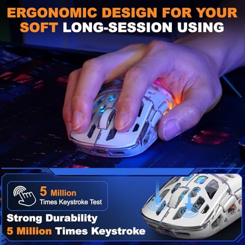 HYRAINBOW - ماوس ألعاب KM-2 لاسلكي شفاف بتصميم خلية النحل، 3 خيارات توصيل 2.4 جيجاهرتز ومنفذ نوع سي وبلوتوث 5.2 و11 إضاءة ار جي بي، قابل للبرمجة مع بطارية تدوم 60 ساعة، للأجهزة بنظام ويندوز وماك من هيرينبو