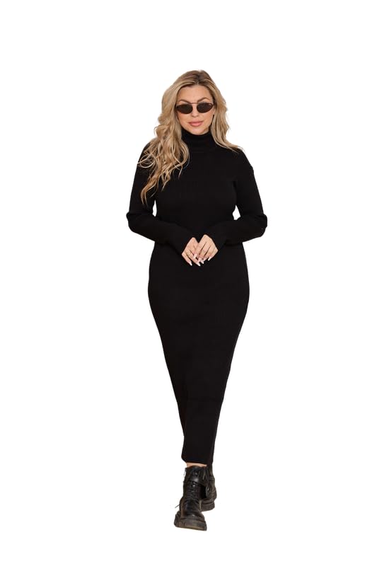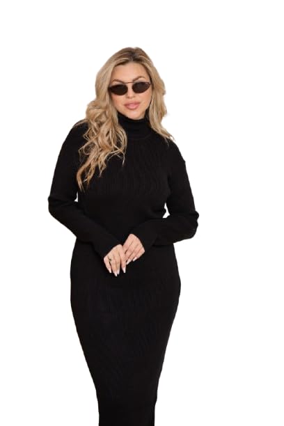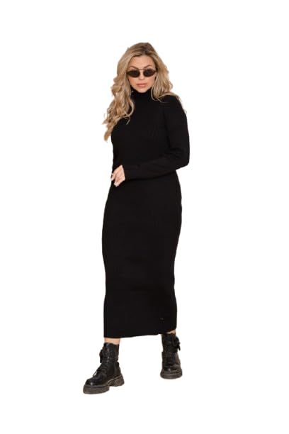 Generic - اي ام - فستان نسائي بياقة عالية - قماش ليكرا ناعم مضلع - اسود