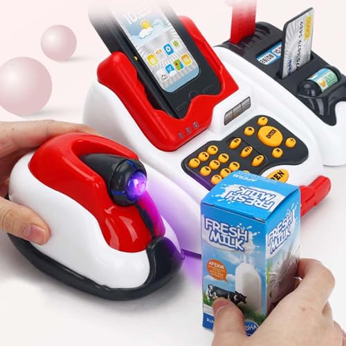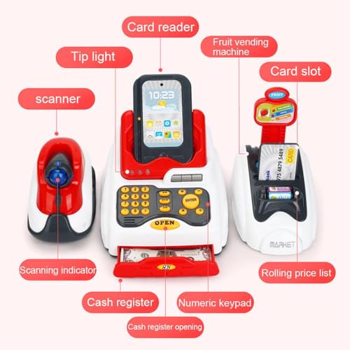 - محتويات الطقم: لعبة كاشير تفاعلية متكاملة تتضمن 24 قطعة من الإكسسوارات مثل سلة تسوق، فواكه، خضروات، هاتف، وماسح باركود لتجربة لعب واقعية