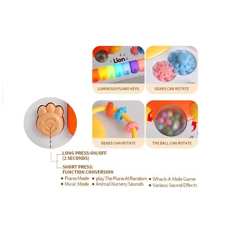 • تصميم تفاعلي: بيانو على شكل أسد مع مفاتيح مضيئة ملونة وأصوات موسيقية متنوعة لتحفيز الأطفال على التعلم