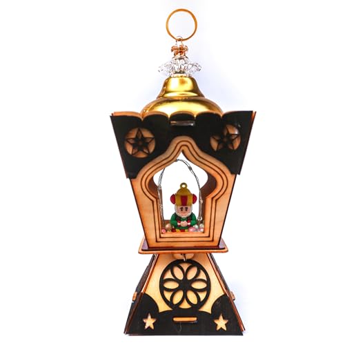 - فانوس رمضان خشبي يتميز بنجوم مقطوعة بالليزر وأنماط أرابيسك، مع تمثال شخصية صغير بالداخل