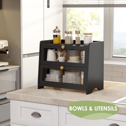JANSNIMEN - صندوق خبز مزدوج الطبقات لسطح المطبخ من جانسنيمين كبير مع نوافذ حامل خشبي بنمط ريفي اسود