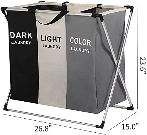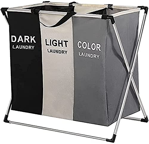 • سلال غسيل ذات سعة كبيرة مكونة من 3 أقسام - مقسمة إلى 3 أقسام، حتى تتمكن من فرز الألوان الداكنة من الضوء أثناء وضع الملابس في الحقائب. يمكن لكل كيس غسيل أن يحمل ما يصل إلى حمولتين قياسيتين من الغسيل.
