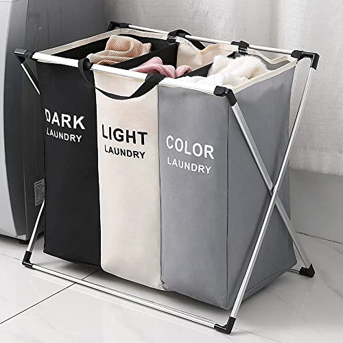 Jorunb - جورونب سلة غسيل من 3 اقسام، سلة فرز الغسيل مع اطار من الالومنيوم، منظم ملابس متسخ كبير قابل للطي مقسم للحمام وغرفة النوم مع جزء علوي شبكي برباط وشنطة غسيل