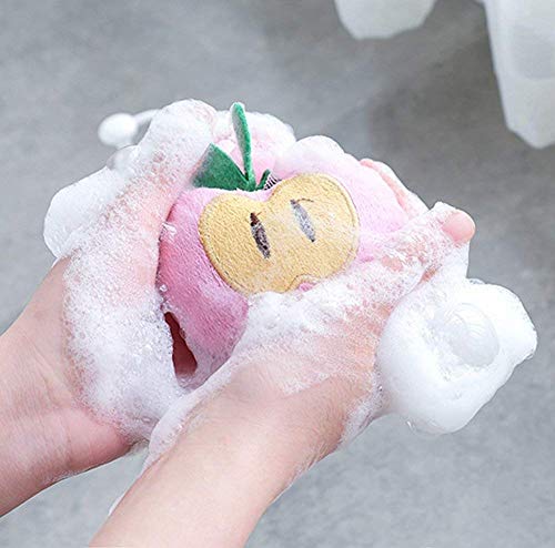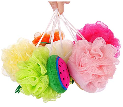 Kaxich - مجموعة اسفنجات حمام شبكية متعددة الالوان مكونة من 5 قطع، مصنوعة من مواد صناعية، للتقشير، اشكال فاكهة، عشوائية، مع حلقة حبل من كاكسيش