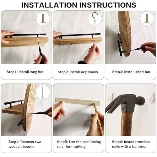 - علاقة مفاتيح سهلة التركيب: يأتي حامل المفاتيح المزخرف الذي يثبت على الحائط مع مثبتات للجدران الجافة ومسامير لا تترك أثرًا ومفك ودليل تعليمات (استخدام اللغة العربية غير مؤكد) وملحقات تركيب أخرى. يأتي كل شيء مثبتًا مسبقًا باستثناء الرف الصغير وحاجز الحماية المعدني فوقه. إذا كنت لا ترغب في حفر ثقوب في الحائط، فيمكنك تثبيتهم بمسامير لا تترك أثر، والتي يمكن أن تدعم وزن 9 كجم.