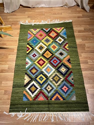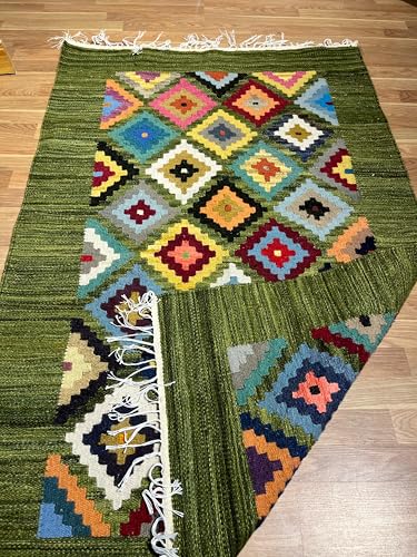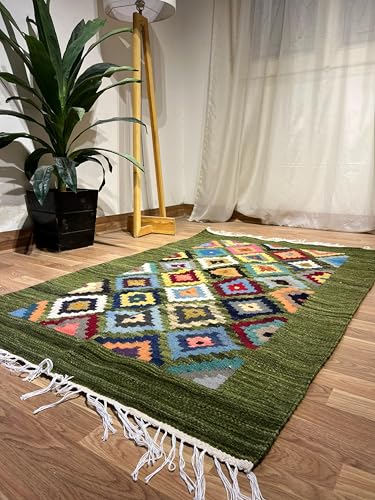 Kilim Studio - بساط كليم متعددة الألوان بقاعدة بلون أخضر غامق من كليم ستوديو، 1 م × 1.5 م