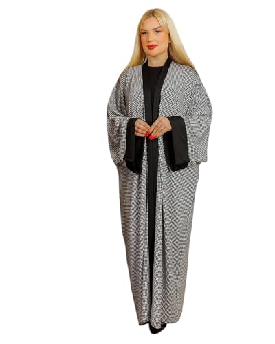 Generic - عباية طويلة بنمط كيمونو، قماش منقوش بالأبيض والأسود، تصميم فضفاض مفتوح من الأمام، تفاصيل سوداء متباينة
