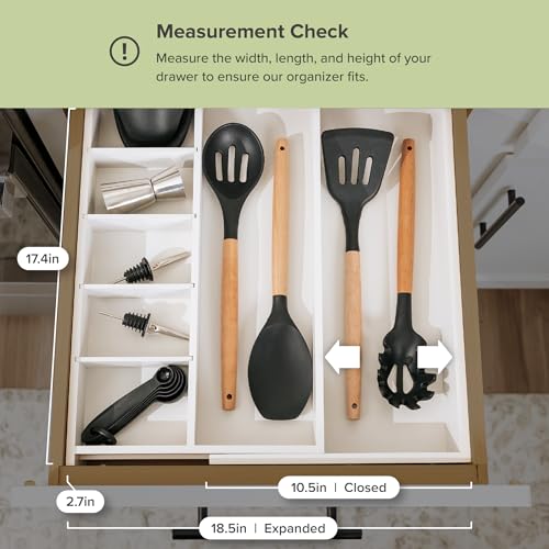 - قم بزيادة سعة التخزين لدرجك: في حين أن منظمات الأدراج المدمجة الأخرى لا تتمدد بنفس العرض، فإن منظم الأدراج هذا يتمدد حتى عرض 19 انش كامل! يضمن هذا التصميم الأوسع أنه يمكنك زيادة سعة التخزين لأدراج المطبخ الضيقة والعريضة.