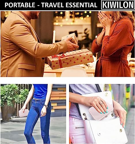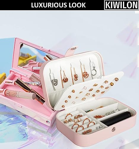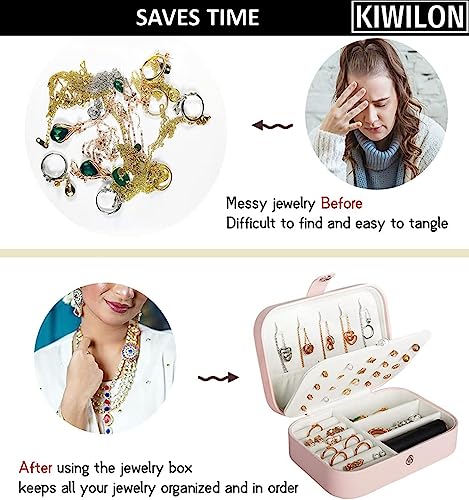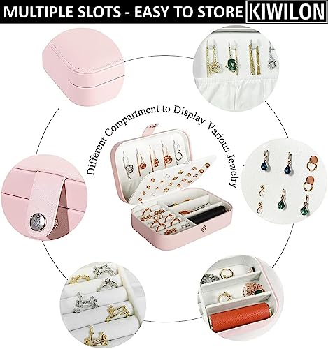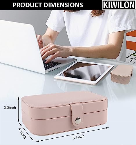 Kiwilon - منظم مجوهرات بمساحات تخزين متعددة من طبقتين من كيويلون، صندوق تخزين مجوهرات محمول للسفر للحلقان والخواتم والسلاسل والأساور (وردي)