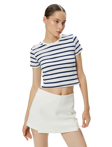KOTON - تيشرت مخطط برقبة دائرية ضيقة وأكمام قصيرة للنساء من كوتون
