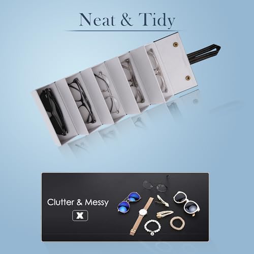 - موفر للمساحة ومثالي للسفر: تصميم قابل للطي، سهل الفتح لتوفير أقصى سعة تخزين. قم بتخزين نظارتك الشمسية والنظارات والمجوهرات وغيرها من الأشياء الصغيرة لتتناسب مع ملابسك اليومية. يمكن لفها وتحتوي على حزام محمول لسهولة الحمل. صندوق منظم النظارات الشمسية الخاص بنا مصنوع من حافظة متينة وصلبة تحمي المحتويات من التلف، وتأكد من بقاء كل شيء في مكانه.