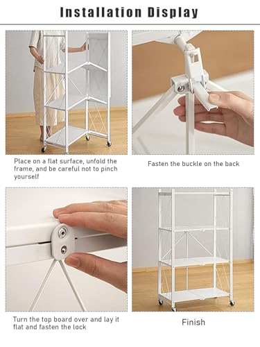 - 【أرفف قابلة للطي من 4 طبقات】: سوف تحصل على قطعة واحدة من رف الوحدات القابل للطي باللون الأبيض مع عجلات. يمكن لوحدة الرفوف تخزين وتخزين لوازم المطبخ أو أغراض غرفة المعيشة أو كتب الدراسة أو اللوازم المكتبية أو أدوات تخزين غرفة المرافق وما إلى ذلك.