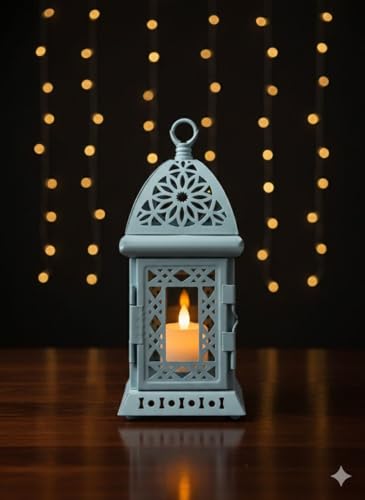 فانوس زخرفي معدني، أزرق فاتح، تصميم مغربي، حامل شمعة، ديكور منزلي