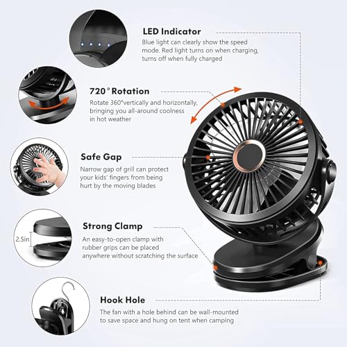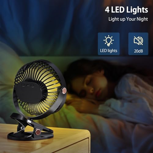 LOVACA - مروحة بمشبك 4000mAh قابلة لاعادة الشحن من لوفاكا، مروحة مكتب وعربة اطفال محمولة هادئة بـ4 سرعات مع ضوء ليلي LED، دوران 360 درجة، مروحة طاولة صغيرة تعمل بمنفذ USB C وبطارية للمنزل والمكتب والتخييم