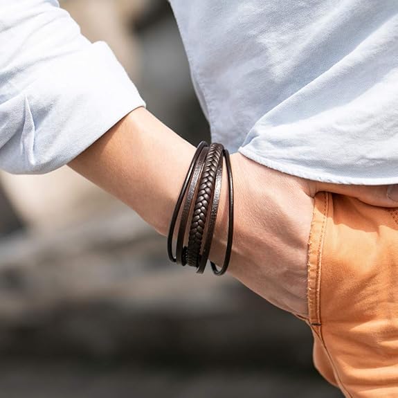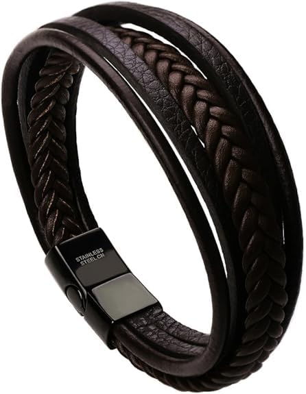 Generic - سوار جلد للرجال من ام ايه اس مع مشبك مغناطيسي متعدد الطبقات من جلد البقر المضفر للرجال