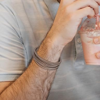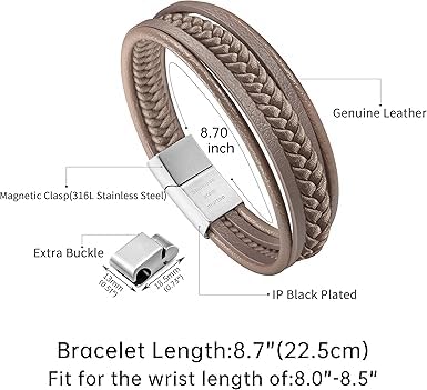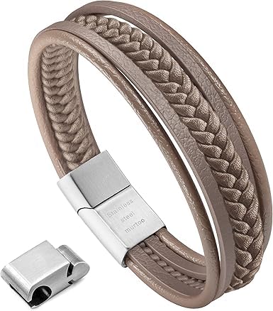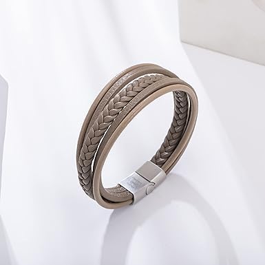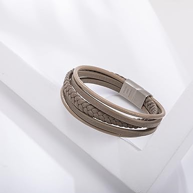 Generic - سوار جلد مضفر متعدد الطبقات بمشبك مغناطيسي من ام ايه سمين، 8.5 انش، بيج داكن وفضي