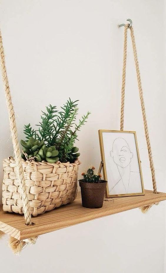 HAYAH LABORATORIES - رف من الخشب بتصميم خيش مقاس 40 سم، رف خشب مزين بالخيش من مكرمية ستور