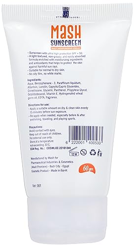 Mash sunScreen - كريم مرطب يومي واقي من الشمس بعامل حماية +50-60 مل، منماش صن سكرين، لنوع البشرةالكلة، 50 SPF