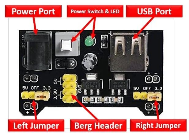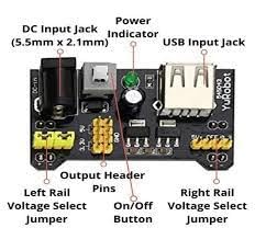 - تحكم مستقل في السكك الحديدية: مزود بوصلات على القضبان اليسرى واليمنى مما يسمح لك بالاختيار بين مخرج 3.3 فولت أو 5 فولت لكل قضيب طاقة بشكل مستقل، بالإضافة إلى مفتاح تشغيل/إيقاف للتحكم المريح في الطاقة