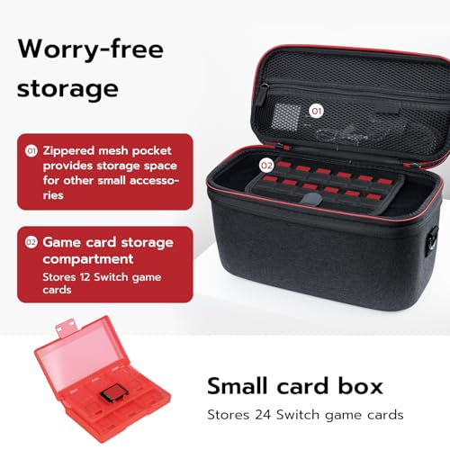 - تخزين إضافي للبطاقات والملحقات: يتضمن جيبًا شبكيًا بسحاب للأشياء الصغيرة وحاملي بطاقات - أحدهما مدمج لـ 12 بطاقة ألعاب وحافظة حمراء صغيرة لتخزين ما يصل إلى 24 بطاقة سويتش إضافية بأمان.
