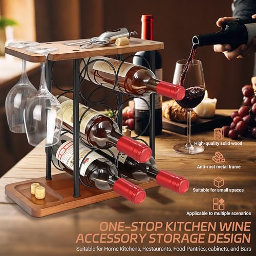Megier - رفوف خشبية لسطح الطاولة مع صينية، حامل زجاجات النبيذ لـ 6 زجاجات و2 كوب، مثالية للمطبخ والبار والطاولة والخزانة وقبو النبيذ