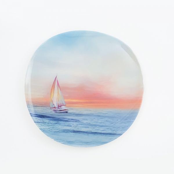 • إلهام التصميم: تصميم مركب شراعي جميل عند غروب الشمس على طبق مسطح من الميلامين، مثالي لخلق جو ساحلي لتناول الطعام