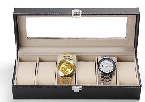 Spaceshoop - صندوق مجوهرات للرجال عالي الجودة مصنوع من الجلد بـ6 حجرات لحفظ الساعات والمجوهرات لون اسود OSBZ12، جلد صناعي