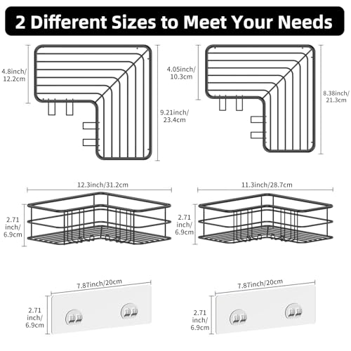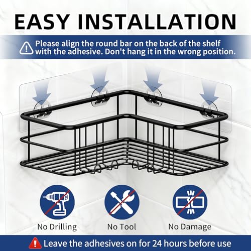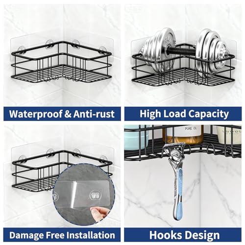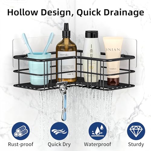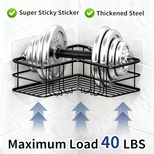 Menbyci - حامل دش زاوية من مينبيسي، رف حمام لاصق مع خطافات، منظم ملحقات حوض الاستحمام من الفولاذ مقاوم للصدأ 304، رف تخزين للشامبو، منظم يثبت على الحائط، لون أسود