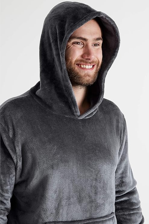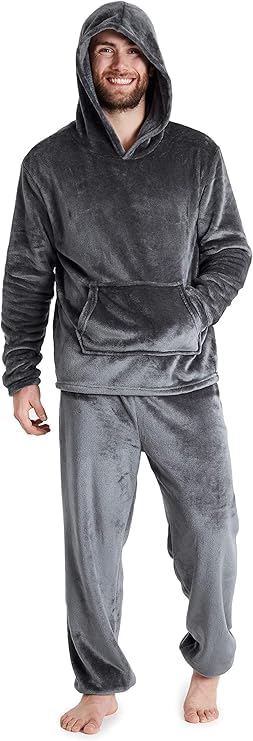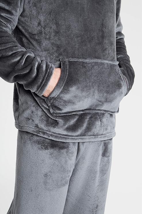 Generic - بيجامة رجالية قطيفة بقلنسوة، طقم من قطعتين، رمادي داكن