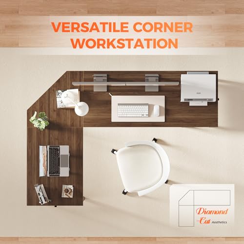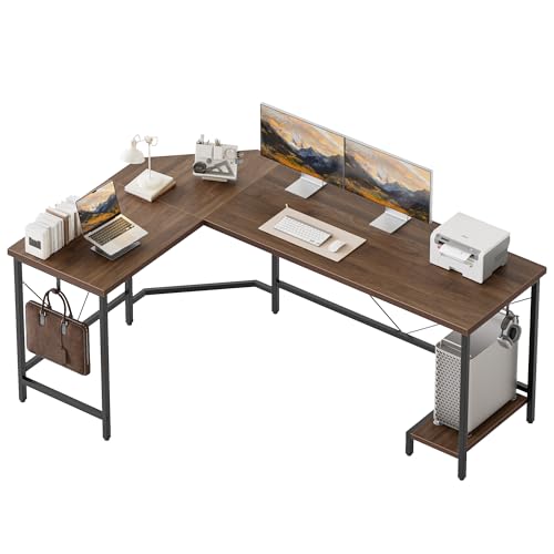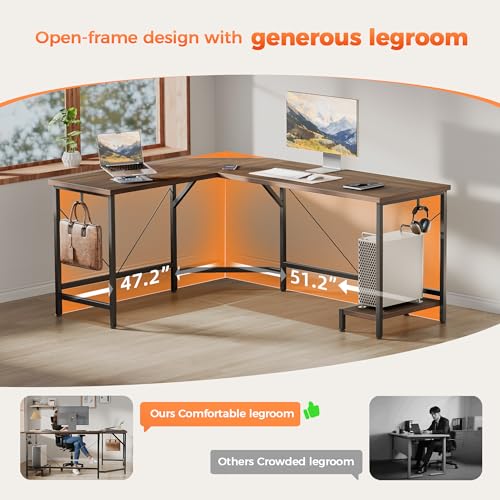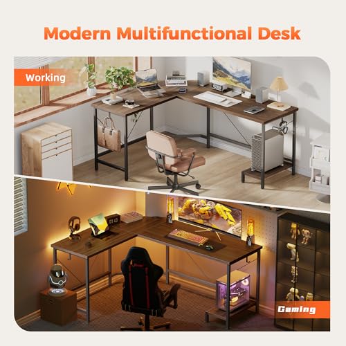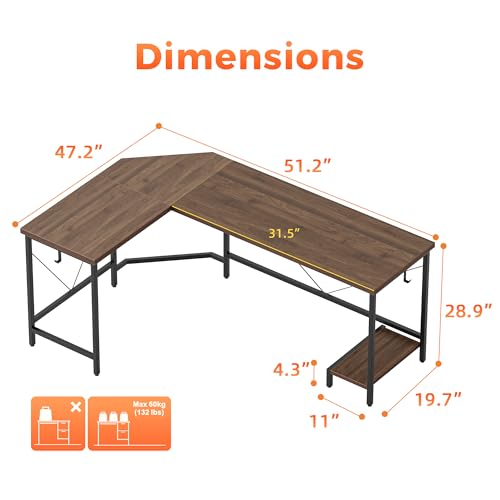 Mericonia - مكتب كمبيوتر عصري على شكل حرف L من ميريكونيا، مكتب زاوية 50 انش مع ارفف تخزين، مكتب العاب زاوية كبير مع حامل وحدة المعالجة المركزية، محطة عمل واسعة للالعاب والعمل، خشب الجوز