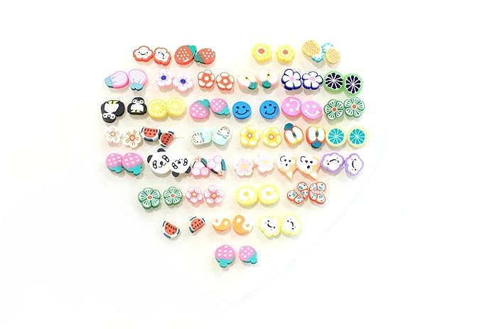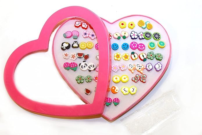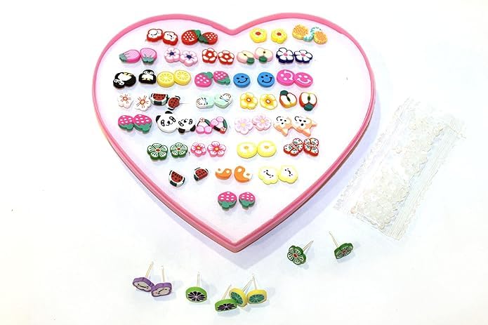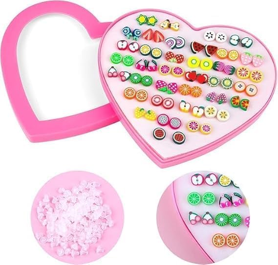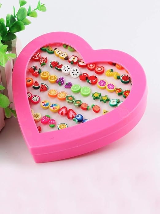 Generic - اقراط معدنية متعددة الالوان بتصميم فاكهة متنوعة | صغيرة اطفال للبنات والنساء الساحرات - مجموعة من 36 زوج &&& عبوة في صندوق على شكل قلب، للفتيات