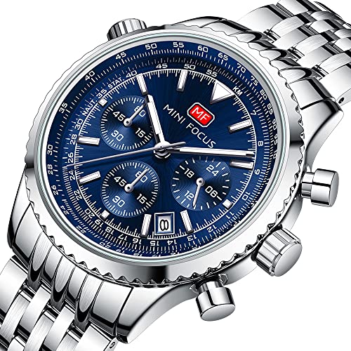 MF MINI FOCUS - ساعة من ميني فوكس للرجال، بمينا زرقاء، عرض تناظري، مقاومة للماء مع كرونوغراف وتاريخ تلقائي